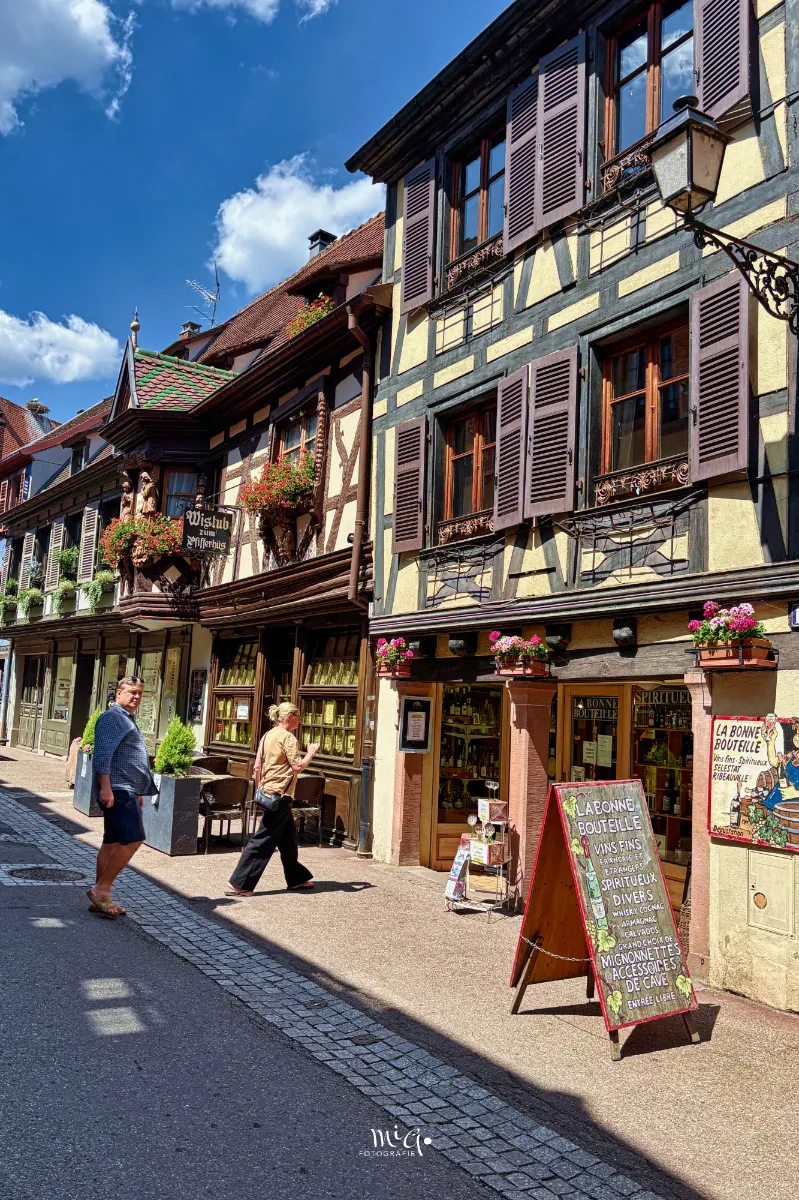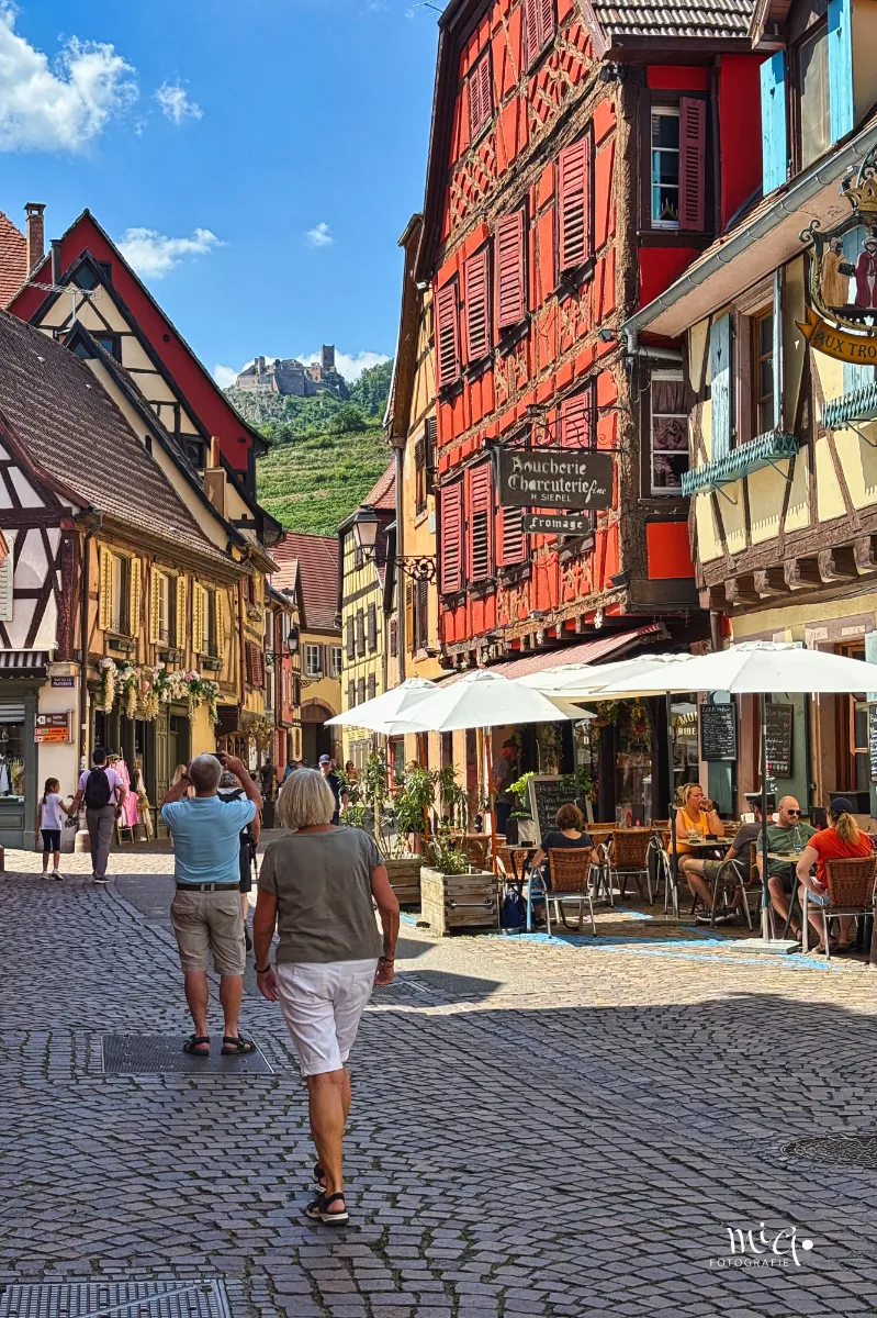 Ribeauvillé (auf Deutsch Rappoltsweiler) ist ein typisches elsässisches Winzerdorf mit vielen gut gepflegten, mittelalterlichen Fachwerkhäusern. Die Ortschaft wird von drei Burgen überragt, wie es in dieser Region üblich ist. Das Wetter ist perfekt, um den Ort zu erkunden.